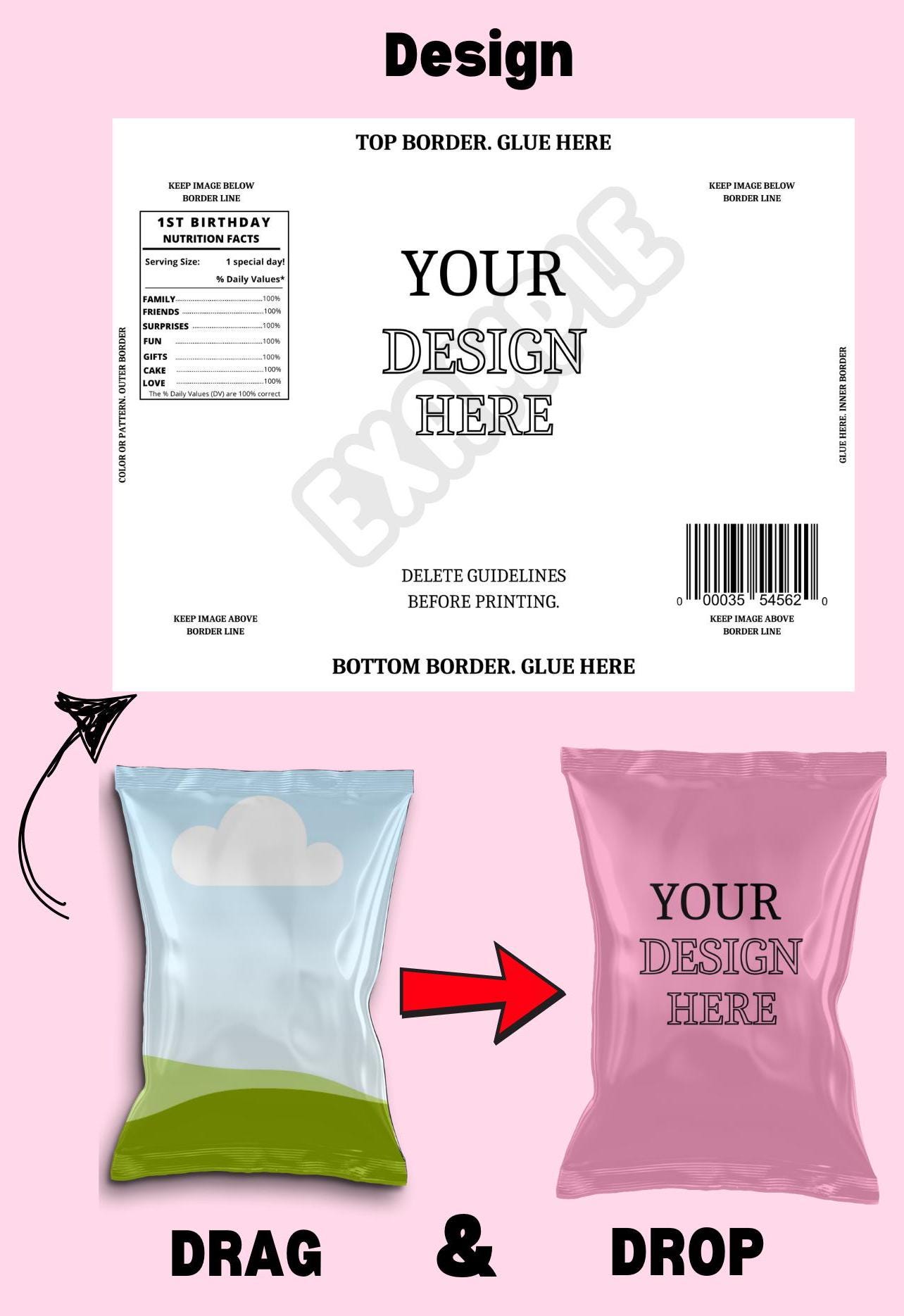 Make your party favors stand out with this fully customizable chip bag template! Perfect for birthdays, baby showers, business promotions, and more. Easily edit in Canva—no software required!